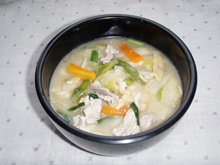 さといも、だいこん、にんじんはいちょう切り、はくさいは3cm長さの短冊切りにする。ねぎは斜めに切る。 |