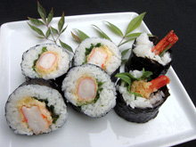 ごはんの手前から1/3のところに青しそを3枚横に並べて、その上にえび天の尾を両端になるようにのせ 、全体に塩を均等に振りかけて一気に巻く。 |