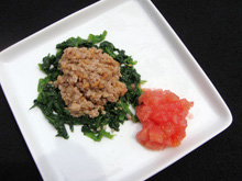 皿の中央にほうれん草を広げ、その上に納豆そぼろをのせて、トマトを添える。 |