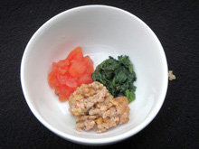 皿に納豆そぼろ、ほうれん草、トマトを盛り合わせる。 |