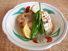 Cを中温の油でゆっくりカラッと揚げる。裏返す時は、底が固まってから返す。ししとうがらしは種を出し、切れ込みを入れ、素揚げにする。 |