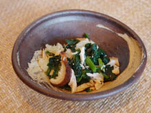 ほうれん草とグレープフルーツにフレンチドレッシングを混ぜるサラダ感覚の和え物です。冷やすと果物のさっぱりとした味が一層引き立ち、夏の食欲のない時にもおいしくいただけます。