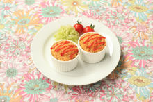 器にEをのせ、ソースをかけてキャベツの千切りとミニトマトを添える。 |
