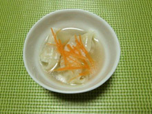 鍋に中華だし、にんじんを入れて中火にかけひと煮立ちさせる。次にぎょうざを加えて煮て、火が通ったら薄口しょうゆで味をつける。 |