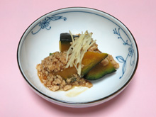 かぼちゃを器に盛り、肉そぼろをかけ、せん切りにしたしょうがを飾る。