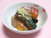 かぼちゃを器に盛り、肉そぼろをかけ、せん切りにしたしょうがを飾る。