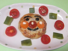 れんこんバーグに焼きのりとにんじん、ケチャップ、チーズでアンパンマンの顔をトッピングする。 |