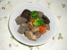 Eの鍋に野菜を入れてさっと炒め、出し汁、鶏肉、しいたけも加える。沸騰したら味を付けて、軟らかくなるまで煮る。 |