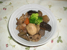 Eの鍋に野菜を入れてさっと炒め、だし汁、鶏もも肉、しいたけを加え、沸騰したら味を付けて、軟らかくなるまで煮る。 |