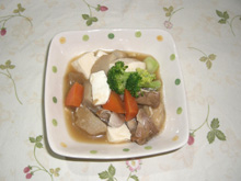 高齢者用の食材を取り出し、やや小さめに切り、出し汁(100g)を加え、豆腐と一緒にさらに軟らかくなるまで煮て、水溶きかたくり粉でとろみを付ける。 |