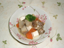 幼児用の食材を取り出して小さく切り、出し汁(80g)を加え、豆腐と一緒にさらに軟らかくなるまで煮る。 |