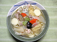 最後に長ねぎ、いもを入れ火が通ったら、しょうゆを入れ味を調える。 |