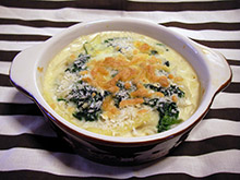 Cに茹でたマカロニとほうれん草を混ぜ合わせ、グラタン皿に入れる。 |