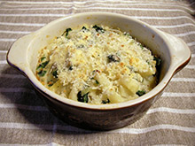 Cにうどんとほうれん草を混ぜ合わせ、グラタン皿に入れる。 |
