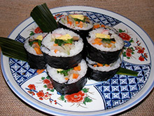 巻きすに海苔をのせ、上部2pほど残して寿司めしを全体に広げ、手前1/3あたりにほうれん草、卵焼き、にんじんとたまねぎ、かに風味かまぼこ、しいたけ煮を横一列に並べて巻く。 |