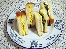 バターを塗った食パンの半分にCをのせ、もう半分にハム、チーズをのせ、全体にDのサニーレタスをのせる。 |