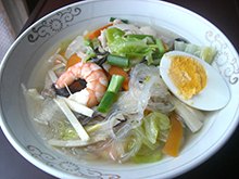 中華鍋に油を熱し、豚肉、にんじん、いか、えび、たまねぎ、きくらげを炒めて、たけのこ、エリンギ、キャベツも加える。次にスープを加えて、はるさめを入れて少し煮込み、調味料を入れて、最後にこねぎを加える。 |