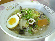 中華鍋に油を熱し、豚肉、にんじん、いか、えび、たまねぎ、きくらげを炒めて、キャベツも加える。次にスープを加えて、はるさめを入れて少し煮込み、調味料を入れて、最後にこねぎを加える。 |