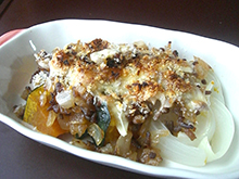 耐熱皿にかぼちゃとたまねぎを並べ、Bのミートをのせ、ピザ用チーズ、パルメザンチーズ、パン粉をのせて、オーブントースターで5分くらい焼く。(アルミカップに入れても良い) |
