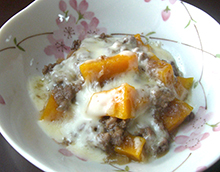 かぼちゃは皮を除いて軟らかくし、牛ひき肉はすり鉢ですることで、口当たりをなめらかにしました。