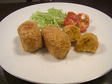 小麦粉、卵、パン粉の順に衣をつけ、きつね色になるまで揚げる。 |