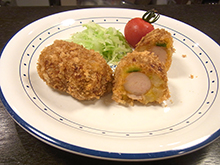 小麦粉、卵、パン粉の順に衣をつけ、きつね色になるまで揚げる。 |