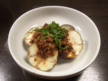 蒸したなすを皿に盛り、肉味噌を上からかける。 |