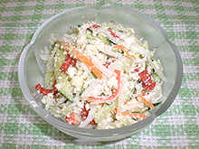 たまねぎは薄くスライスし、しばらく水にさらしておく。きゅうりは斜め薄切りにしてから、細切りにする。 |