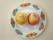 袋の下の角を1p程度三角に切り落とし、絞り袋のようにして生地をアルミカップに入れ、上にスライスしたバナナをのせる。 |