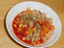 鍋にオリーブ油、にんにくを入れ弱火で炒めて香りを付け、豚もも肉、たまねぎ、にんじんを入れてたまねぎが半透明になるまで炒める。 |