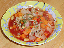 鍋にオリーブ油、にんにくを入れ弱火で炒めて香りを付け、豚ばら肉、たまねぎ、にんじんを入れてたまねぎが半透明になるまで炒める。 |