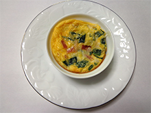 ココット型(100cc程度)にEを入れ、オーブンの天板に水を入れ、180℃で20分程度湯せんにかける(卵液が固まっていればよい。)。 |