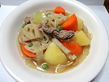 じゃがいも、にんじんは乱切りし、たまねぎは5mm幅で繊維と直角に切る。れんこんは5mm幅のいちょう切りにする。 |