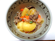 調味料を入れて、さらに5分程度煮る(じゃがいも、にんじんが軟らかくなるまで)。 |