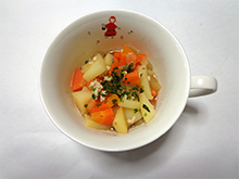 じゃがいも、にんじんは、3mm幅のいちょう切りに、たまねぎはくし形に切った後、繊維に直角に5mm幅に切る。 |