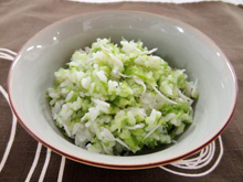 アーサ(あおさ)の量を増やして食物繊維を増やし、ツナ(オイル缶)をしらす干しに代えることでエネルギーと脂質の量を減らしました。アーサのグリーンが清涼感を感じさせる一品です。