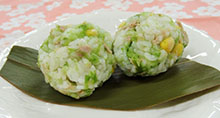 ホールコーンを加えることによって甘味と彩りをアップさせました。おにぎりにすることで手づかみ食べにも向きます。食事だけでなく、おやつにもおすすめの一品です。
