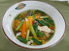出し汁に千切りにしたレバー、豚肉、泡盛を加えて、あくを除きながら煮込む。 |