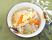 鍋に分量のかつおだしと豚茹で汁を入れて火にかけ、こんにゃく、とうがん、にんじん、しいたけ、豚肉の順に入れて煮る。火が通ったら塩としょうゆで味を調える。 |