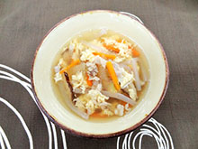 しいたけ、とうがん、にんじん、こんにゃくを豚肉の大きさに合わせて切りそろえ、こんにゃくは茹でておく。 |