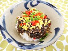 Eを丼に盛り、Dを中央にかける。さらに少し残しておいたAとピーマンをちらす。 |