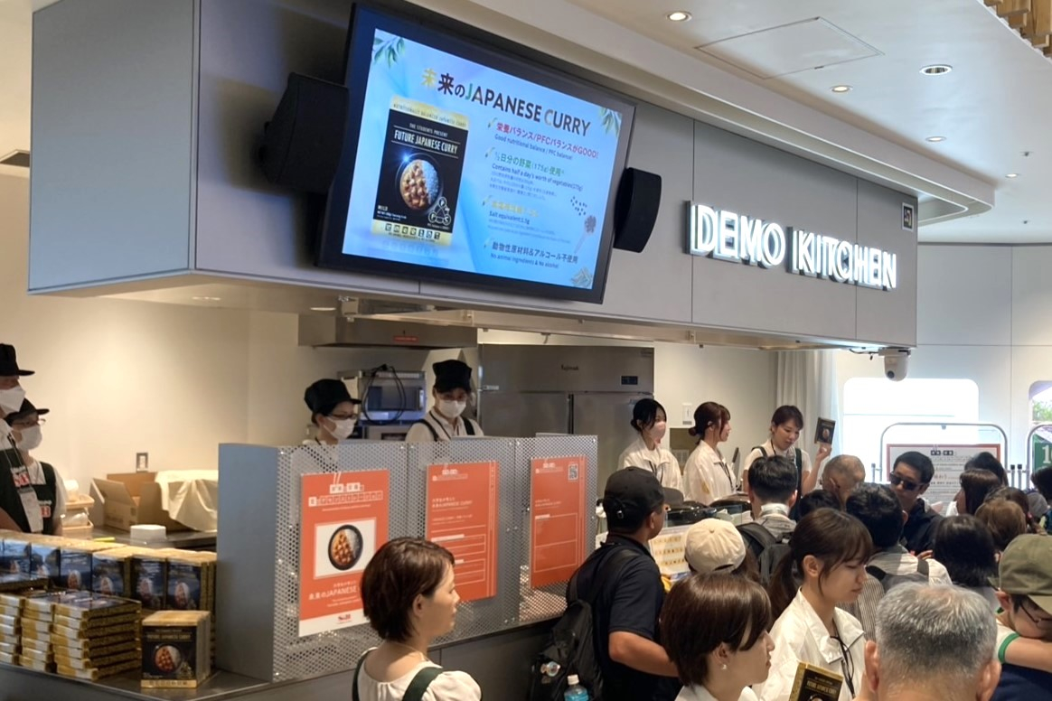 また、デモキッチンエリアでは協賛企業による「未来の栄養・食」の提案、試食やサンプリングが9日(土)まで毎日行われます。8月3日(日)の初日はエスビー食品株式会社による、大阪公立大学生が考えた「未来のJAPANESE CURRY」が登場。「フードダイバーシティ」、「栄養バランス」、「減塩」をコンセプトにしたカレーの試食とレトルトパウチしたカレーの配布が行われ、「家族が大好きなカレーがヘルシーに楽しめるのがいいですね」、「本格的な味わいでとてもおいしい」等、来場者にも大好評でした。