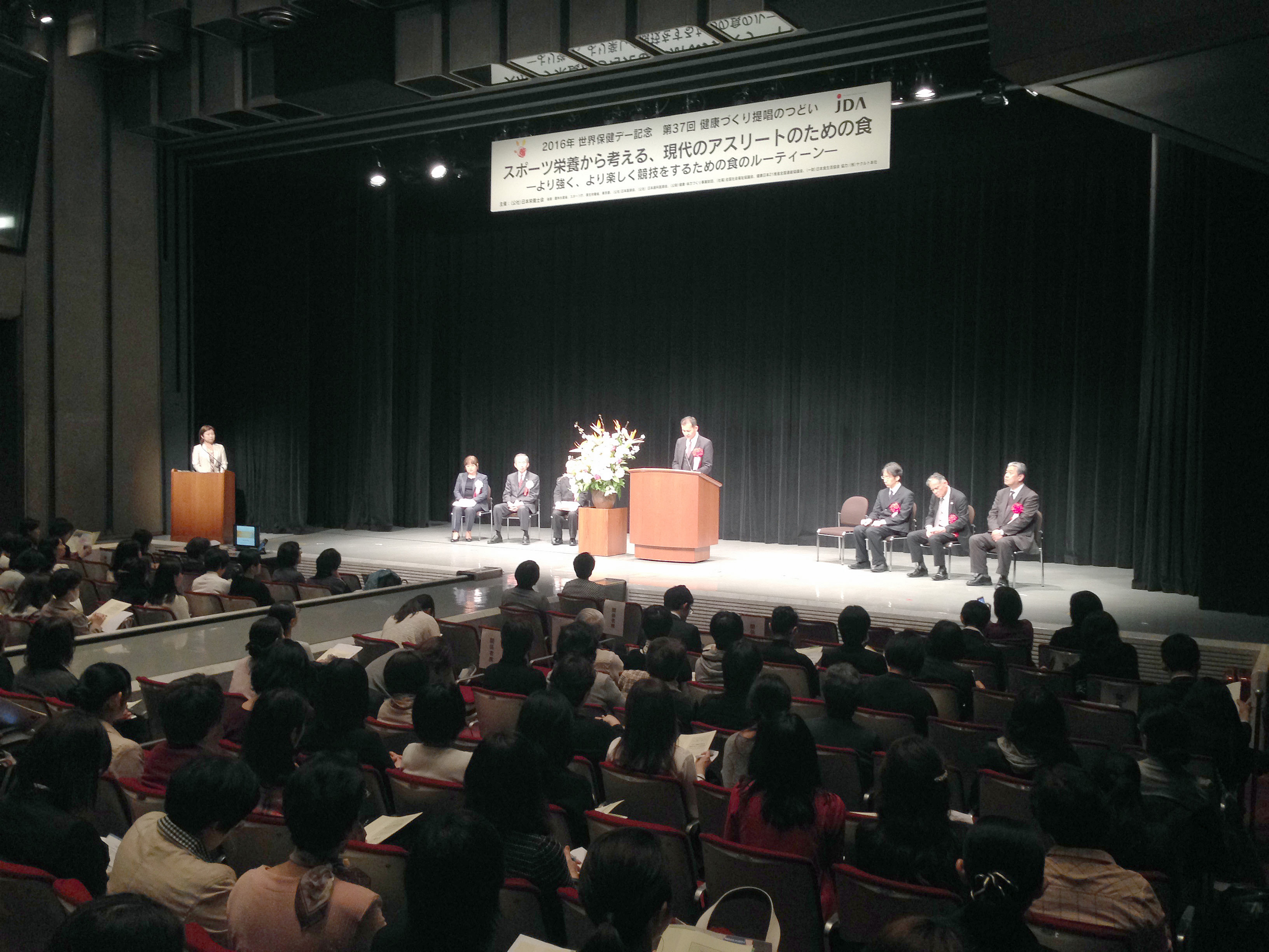 平成28(2016)年4月7日、第37回「健康づくり提唱のつどい」が、東京都港区のヤクルトホールで開催されました。同会は、WHO(世界保健機構)の提唱する「世界保健デー」の4月7日に、公益社団法人である日本栄養士会が、社会活動の一環として昭和55(1980)年より開催しています。今回は、国際的な競技大会などでも話題の「スポーツ」に注目、「スポーツ栄養から考える、現代アスリートのための食―より強く、より楽しく競技をするための食のルーティーン―」をテーマに、満員の522名が参加、大盛況となりました。