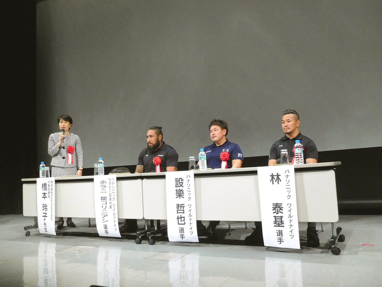 その後、ワイルドナイツのホラニ 龍コリニアシ選手、設樂哲也選手、林泰基選手がゲストアスリートとして登壇、設樂選手は、「社会人選手になり栄養サポートを受けてから体重とともに体脂肪が6%も減少し、自然とパフォーマンスが上がるようになった」と話し、林選手は「食べるタイミング、量、質をコントロールできるようになれば常に良いコンディションでいられる。続けることが大切」と栄養管理の実感を述べました。また、ホラニ選手は「日本の子どもたちは食事をしっかり食べていない。栄養というカテゴリーにこだわりすぎず、しっかり食べて大きく育ってほしい」と次世代のアスリートを激励しました。
