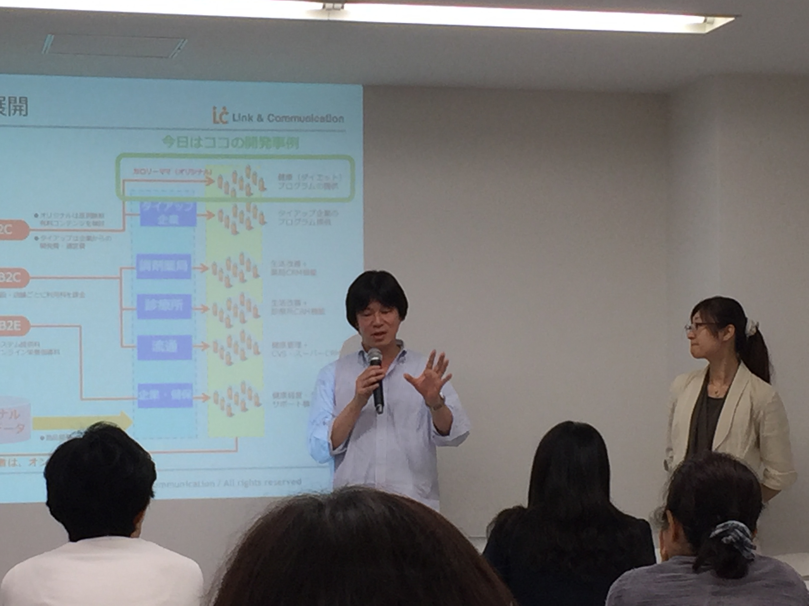 内容:リンクアンドコミュニケーションでは2004年より食事指導支援サービス「カロリーママ」を開始しました。カロリーママが目指すのは、専門家が近くにいて健康をサポートしてくれる世界です。管理栄養士の指導を受ける方は、現状で疾病があったり、指導が必要な方々がほとんどです。もっと多くの人に必要な時にいつでも専門家のアドバイスを届けたいという課題に基づいて、科学的エビデンスと10万人分の栄養指導記録によるノウハウの蓄積と管理栄養士・栄養士7,000人のネットワークによる情報収集により一人ひとりにあった具体的な提案が出来るアプリであり、今後もより利用しやすく、興味をもつ人が増えるように変化させていきたとお話しされていました。