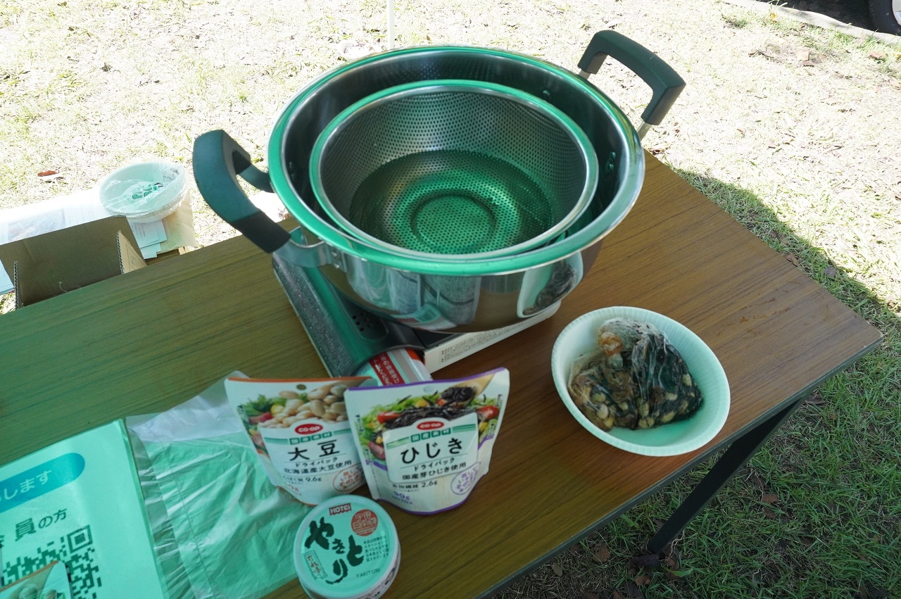 公益社団法人愛知県栄養士会は本会賛助会員であるトーアス株式会社と協力して、献血・防災体験コーナーにおいて、防災メシ体験としてパッククッキング「ひじきと大豆の煮もの」の実演と体験(試食)を行いました。