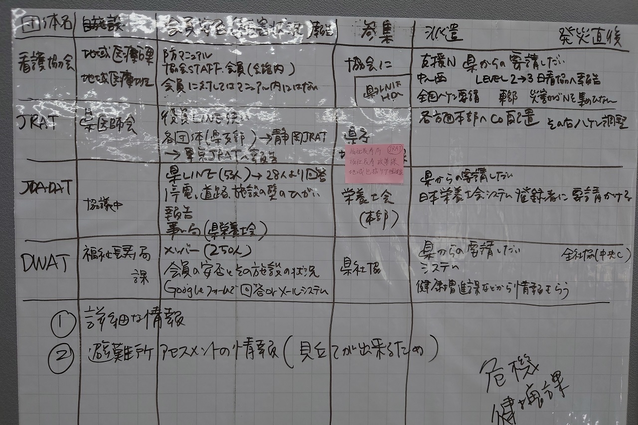 DMATをはじめとする医療チームの報告会議に参加して、各支援団体より初動対応の状況と派遣調整の進捗などを報告しました。