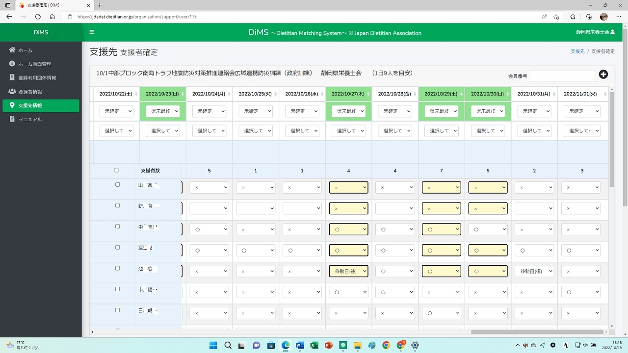 人的支援マッチングシステム「DiMS(Dietitian Matching System)」による派遣調整訓練を実施しました。想定災害の規模では広域支援が必要でしたが、静岡県栄養士会内の訓練であるため、被災地完結型での派遣調整を行い、90分間という短い派遣調整訓練の中でも120名の登録者のうち20名から支援活動への応募がありました。