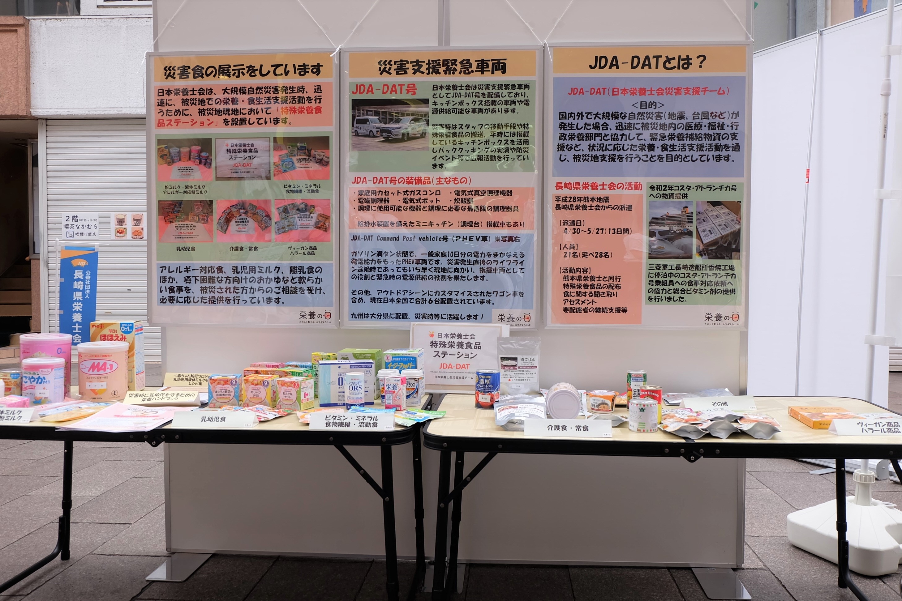 JDA-DAT長崎では展示ブース「災害対策」において、災害時の備えや食支援についてのご紹介、災害支援緊急車両(JDA-DAT号)や搭載品・特殊栄養食品の展示も行いました。