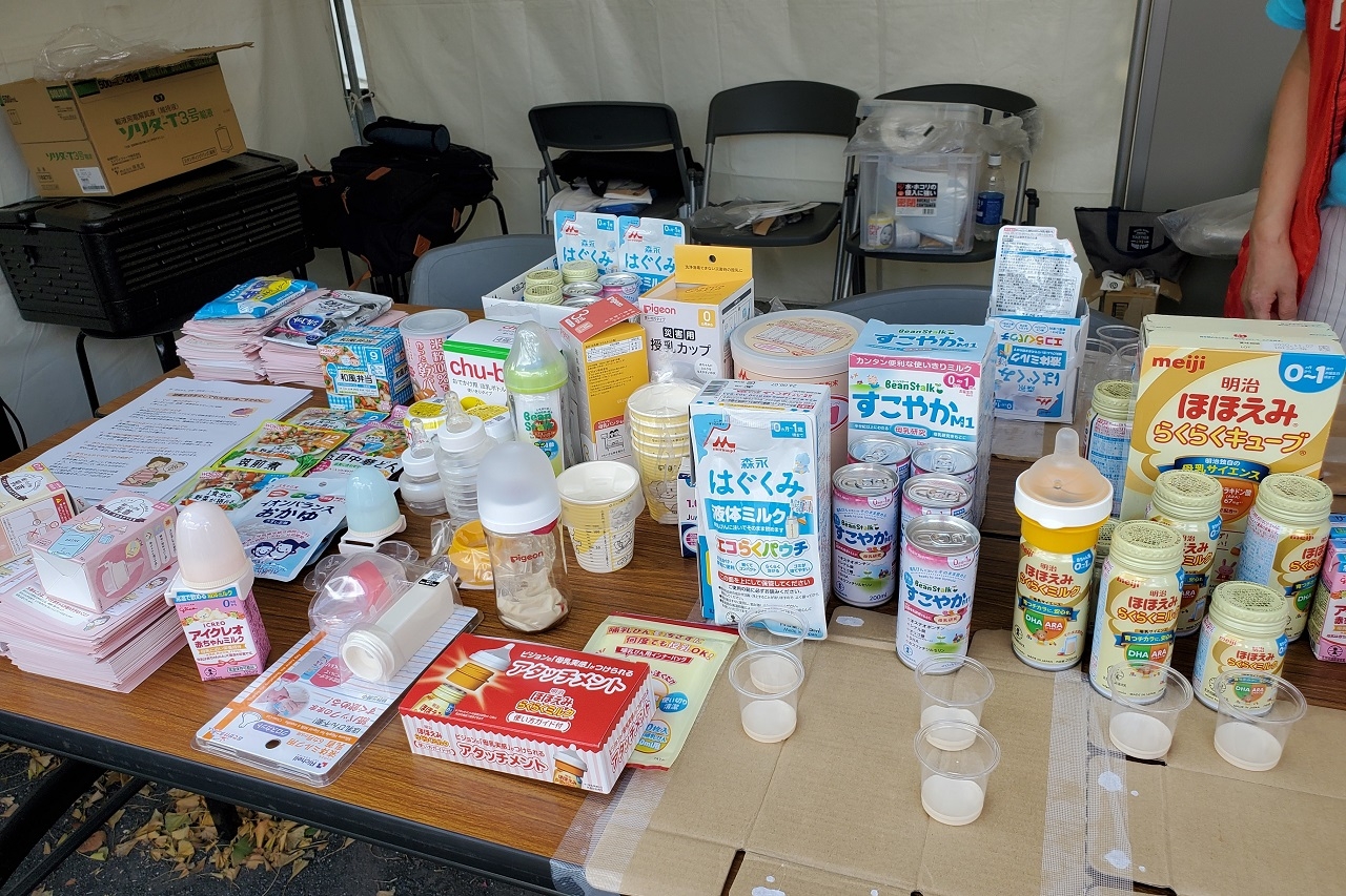 東京都栄養士会のブースでは、JDA-DAT号の展示やパッククッキングの実演、レシピの配布を行いました。また、当日は4社の協賛を得て、災害時の液体ミルクの適切な使用方法などについてレクチャー。液体ミルクの特性、災害時における活用法の解説からアセスメントを実施し、調乳のデモンストレーション、試飲を行いました。